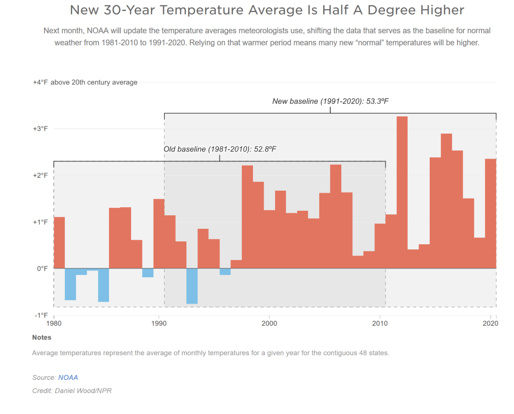 New normal for what the temperature changed because NOAA updated the temperature average that meteorologist use. The baseline for normal weather from 1981-2010 was 52.8 degrees Fahrenheit. The new baseline from 1991-2020 is 53.3 degrees Fahrenheit. This is a 1.5-degree Fahrenheit increase. While this may not appear to be big jump, it is easy to get accustomed to shifts in temperature. How does this impact extreme weather events or rising electricity costs? How can we compare new relative positions?